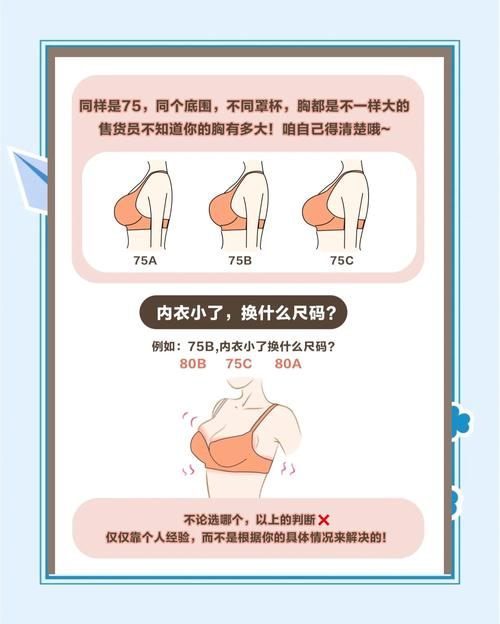 因此,有时75C和80B的胸罩都可以穿着,这取决于个人的胸型和舒适度。在实际选取胸罩时,可以将70C、75B和80A视为相近的体积,但请注意,这只是一个非常粗略的估计。为了找到最合适的胸罩尺寸,比较好是试穿并比较不同尺寸的实际感觉。