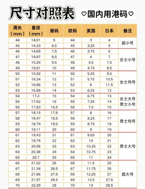 〖One〗、周大福的戒指尺寸是根据港版标准制定的,适合中国香港地区的佩戴习惯。港版尺寸范围从7号至24号,女性适用尺寸为7号至15号,男性则为16号至24号。例如,7号戒指的直径大约为190毫米,周长约为47毫米。若直径为125毫米,周长约为48毫米,则应选取8号戒指。