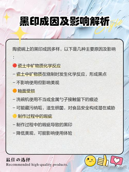 如果陶瓷碗上黑点较多则属于质量问题,如果只有零星几个,那么可能不属于质量问题。以下是具体分析:较多黑点属于质量问题:陶瓷碗在生产过程中,如果工艺控制不当,可能会导致陶瓷胚体中的杂质未能完全排除,从而在烧制后形成黑点。这些黑点不仅影响美观,还可能表明陶瓷碗的质量存在问题。