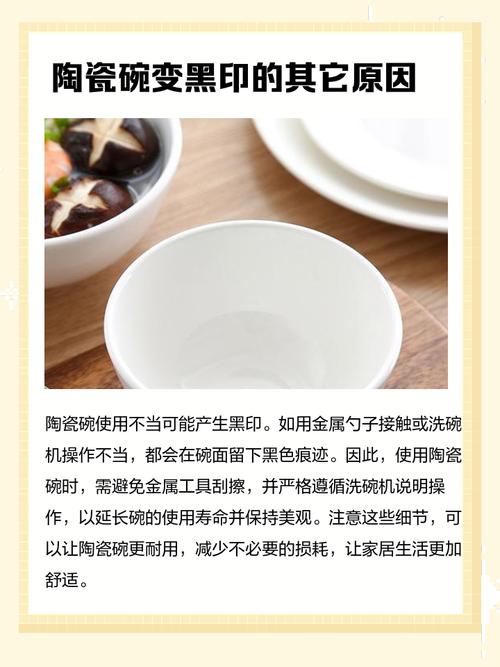 瓷釉磨损:日常使用中,瓷碗的瓷釉表面可能会因为刮擦而磨损,露出下面的瓷质,形成小黑点。 表面不够光滑:如果瓷碗在制造过程中表面处理不够精细,可能会吸附微小的尘埃或杂质,这些杂质随时间积累后可能形成小黑点。 清洗不当:使用不当的清洁剂或清洗方式可能会损伤瓷碗表面,导致瓷釉损坏,进而出现小黑点。