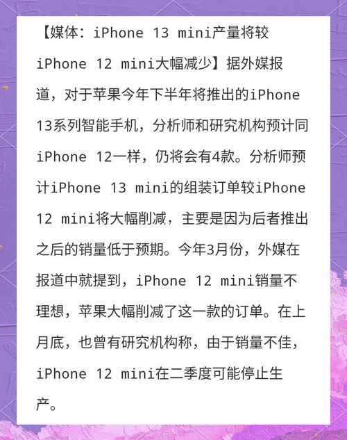 〖Five〗、产能调整:为了应对芯片短缺,苹果在2021年对iPhone 12系列的产能进行了调整。相比于2020年,整体生产数量有所减少,但减少的主要机型是iPhone 12 mini,而非iPhone 12 Pro。减产原因:虽然iPhone 12 mini在iPhone 12系列中销量垫底,但其表现仍然优于大部分安卓旗舰机。