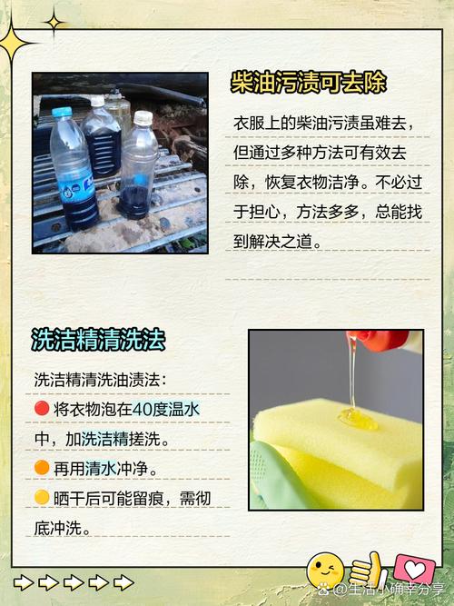 〖One〗、衣服上柴油的清洗方法如下:使用汽油或酒精清洗:步骤:将汽油或酒精滴在有柴油污渍的位置。原理:汽油或酒精可以分解柴油中的油分子,从而有效去除污渍。静置溶解:时间:静置约5分钟,让汽油或酒精充分溶解柴油污渍。搓洗污渍:方法:使用洗衣粉或洗衣液在柴油污渍处进行搓洗。目的:去除已经溶解的柴油以及可能残留的汽油或酒精。