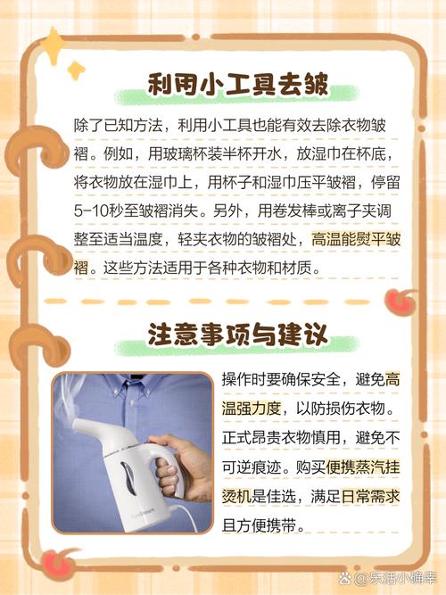 〖Two〗、去除衣服上的褶子,可以采取以下几种方法:喷水抻平法:步骤:在衣服褶皱处均匀喷上水,然后用手轻轻抻开衣服,使褶皱展平。优点:操作简单,适合快速去除轻微褶皱。保温瓶滚动法:步骤:将保温瓶装满热水并塞紧瓶盖,然后将衣服平摊,把保温瓶放在皱褶处来回滚动。优点:适用于不易熨烫的衣物,如针织衫等。