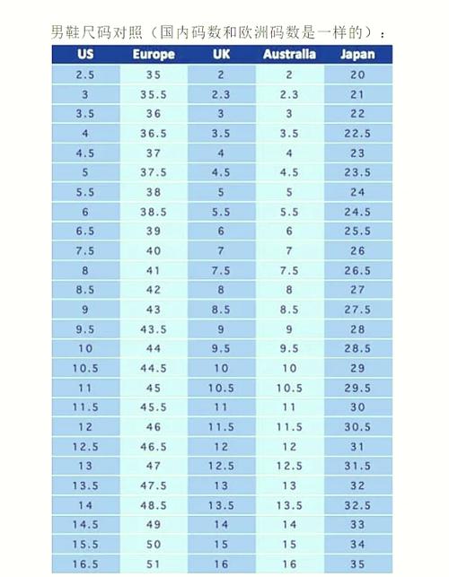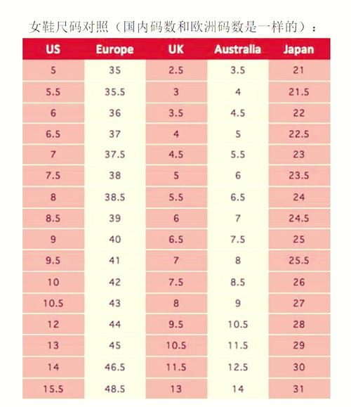 码对应37号鞋,5码对应38号鞋。 如果是欧码,鞋码与脚长之间的换算关系大致如下:5码对应37号鞋,5码对应38号鞋,6码对应39号鞋,5码对应40号鞋。 需要注意的是,不同品牌的鞋子尺码可能存在偏差,有的品牌可能普遍偏大或偏小一码,但大多数情况下,上述换算关系是适用的。