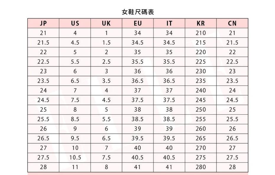 US:代表美国尺码,采用的是美国的鞋码标准。 UK:代表英国尺码,依据的是英国的鞋码标准。 EUR:代表欧洲尺码,这一标识表示欧洲广泛使用的鞋码系统。 BRA:代表巴西尺码,是根据巴西的尺码标准来标注的。 JP:代表日本尺码,专门用于日本的鞋码体系。