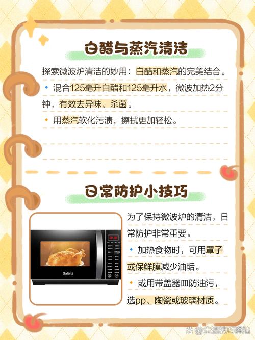 〖Four〗、方法一:白醋除垢法。准备一个碗,倒入适量白醋,加少量水稀释,将碗放入微波炉中,高火加热3 - 5分钟。让白醋蒸汽充满微波炉内部,利用蒸汽软化油垢,之后用湿抹布擦拭即可。方法二:柠檬清洁法。把柠檬切片放入装有水的碗中,放入微波炉高火加热5分钟左右。