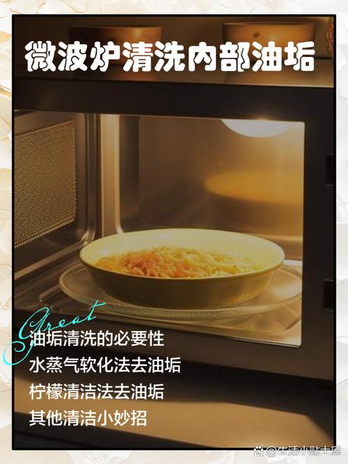 〖One〗、方法一:利用蒸汽软化油垢在碗中加入适量清水,再滴入几滴柠檬汁或白醋,放入微波炉中高火加热3 - 5分钟。让产生的蒸汽充满微波炉,这样能使油垢软化,之后用湿抹布轻轻擦拭即可。方法二:使用专用清洁剂购买微波炉专用清洁剂,喷在有油垢的地方,等待几分钟让清洁剂发挥作用,再用湿布擦拭干净。