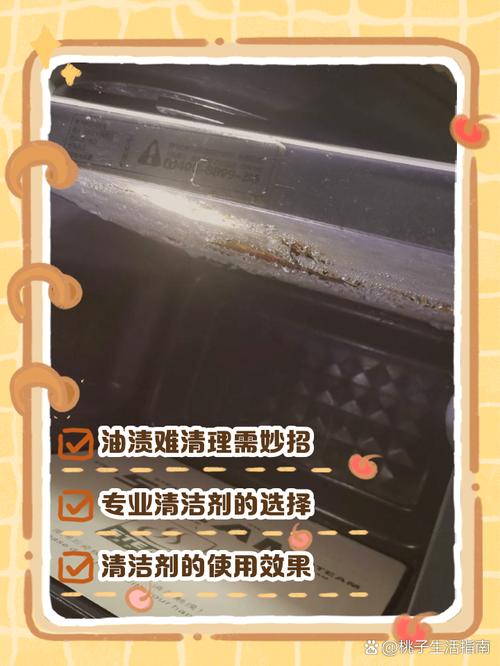 〖Three〗、方法一:利用蒸汽软化油垢在微波炉中放置一碗加了白醋或柠檬汁的水,高火加热几分钟,让蒸汽充满微波炉内部,使油垢软化,之后用湿抹布轻松擦拭即可。方法二:使用清洁液将洗洁精和水按一定比例混合,制成清洁液,喷在油垢处,等待几分钟后,再用海绵或抹布擦拭。