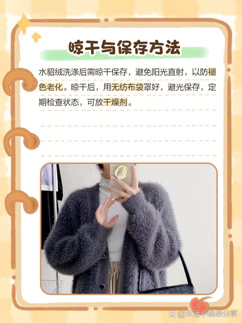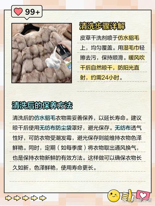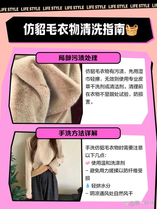 〖Two〗、选取专用洗涤剂:使用专用的丝毛洗涤剂或者柔和的中性洗衣液去清洗。先将洗涤剂稀释在清水中,然后放入水貂绒衣物浸泡。手轻轻抓洗:用手轻轻抓洗水貂绒衣物,避免用力搓揉,以免损坏毛绒和导致缩水。平铺晾干:洗好后的水貂绒需要平铺放置在阴凉通风的地方晾干,不要拧水,也不要挂晾,以免变形和缩水。