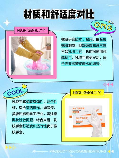 〖Four〗、洗菜手套硅胶比乳胶更好。以下是具体原因:耐高温且不易老化:硅胶手套具有耐高温的特性,相比乳胶手套在使用过程中更不易老化,因此正常寿命更长。对皮肤无害:硅胶手套对皮肤没有任何危害,而乳胶手套由于太软,容易出现小洞和破裂现象,可能对手部皮肤造成潜在风险。