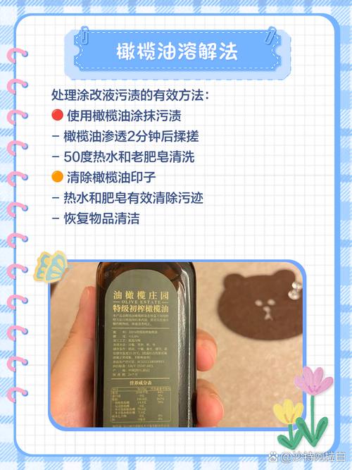 风油精去除法:将少量风油精滴在衣物上的涂改液污渍处,轻轻揉搓后放入清水中漂洗,可有效清除涂改液渍,即使是长时间遗留的渍迹也能去除。 有机溶剂溶解法:由于涂改液通常使用有机溶剂作为溶剂,可以将衣物浸泡在四氯化碳、汽油或丙酮中,这些溶剂能溶解涂改液,从而轻松去除污渍。