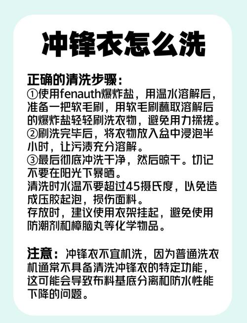 〖One〗、清洗冲锋衣的三种主要方法如下:手洗法:使用中性洗涤剂:选取中性洗涤剂是关键,避免使用碱性产品如洗衣粉和肥皂。预处理污渍:将洗涤剂溶解在水中,对污渍重的地方进行预处理,用软刷轻轻刷洗。手洗并自然晾干:清洗后务必手洗而非机洗,避免洗衣机的脱水功能对GTX薄膜造成损害,应自然悬挂晾干。