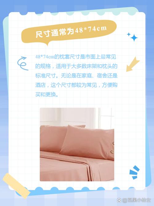 四件套中的枕套尺寸通常为48*74cm。以下是关于四件套枕套尺寸的详细解标准枕套尺寸 对于大多数四件套产品,枕套的标准尺寸为48*74cm。这个尺寸适用于大多数家庭使用的枕头,能够提供足够的包裹性和舒适度。
