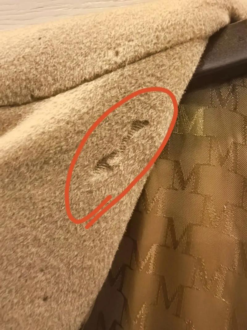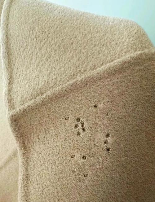 羊绒大衣受到虫蛀时的样子可以通过以下图片展示:虫蛀指的是衣物被虫子蛀坏。羊绒大衣为何会生虫?这是因为羊绒大衣含有大量的动物蛋白,成为了一些小虫子的美食。如果收藏时不加以注意,比如没有放置驱虫剂,就很容易出现虫蛀问题。