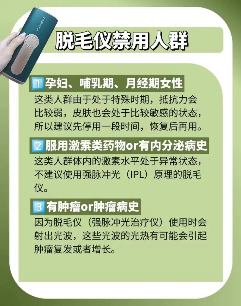 蒂丝家用光子脱毛仪存在一些禁忌情况,以确保安全使用。首先,孕妇和处于月经期的女性应当避免使用。此外,儿童由于皮肤敏感,也不适合使用该产品。对于光敏感人群,尤其是有过瘢痕体质的人,强烈建议避免使用。