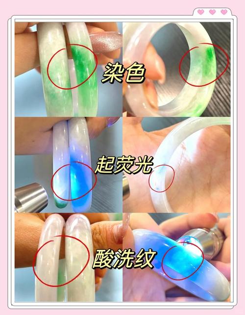 〖Three〗、注胶的翡翠手镯会变色。注胶的翡翠手镯由于其加工过程中采用了强酸浸泡和注胶手段,内部结构已经被破坏,导致颜色分布不均,缺乏层次感,且不会发出天然的翡翠荧光。这样的处理使得翡翠的性质变得不稳定,容易在时间和环境的影响下发生颜色变化。