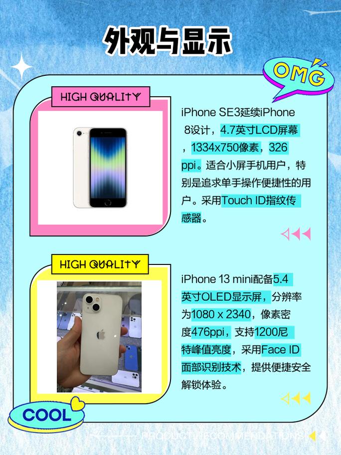 苹果13和苹果SE3在多个方面存在显著差异。首先,苹果13配备了1英寸的Super Retina XDR显示屏,分辨率高,显示效果细腻,而苹果SE3则采用了7英寸的IPS显示屏,尺寸较小,分辨率也相对较低。