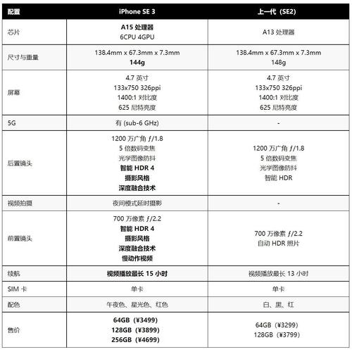 运行内存:iPhone SE3配备了4GB的运行内存(部分版本),而iPhone SE2的运行内存为3GB,这意味着SE3在多任务处理上可能更为出色。网络支持:iPhone SE3支持5G网络,而iPhone SE2仅支持4G网络。对于追求高速网络体验的用户来说,SE3更具吸引力。