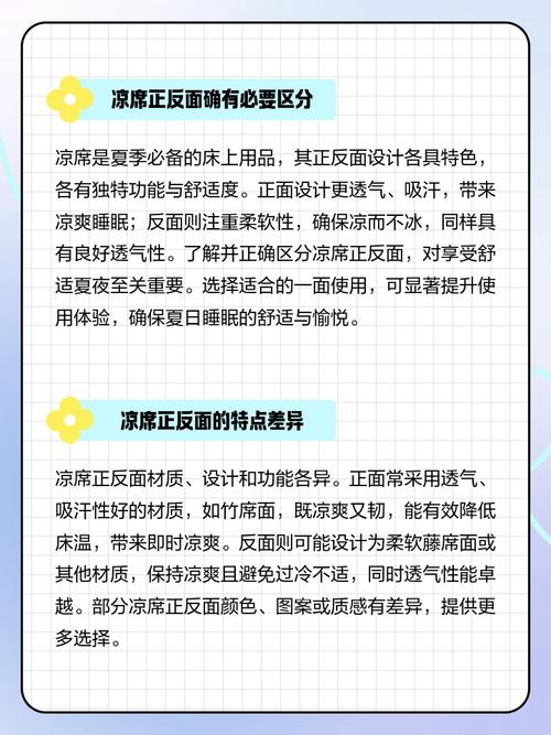 〖Four〗、凉席较光滑的那一面为正面,应朝上放置。以下是关于凉席哪面朝上的详细解释:正面特征:凉席的正面通常比较光滑,这是因为其表面有一层很薄的蜡,这层蜡不仅能增加凉席的光滑度,还能使其更加凉爽。