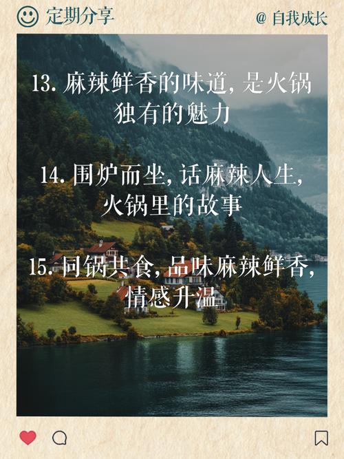 热火朝天:形容吃火锅时的热闹氛围,热气腾腾。红红火火:象征火锅的红色和热烈气氛,非常形象。菜品新鲜:突出火锅食材的新鲜程度,是火锅美味的关键。汤底浓厚:描述火锅汤底的浓郁口感,是火锅美味的基础。麻辣鲜香:结合了麻、辣、鲜、香四种味道,形容火锅口味丰富。