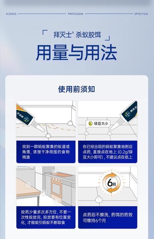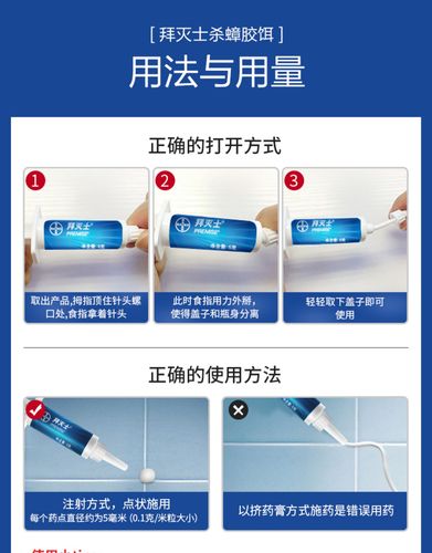 〖Six〗、拜灭士杀蟑胶饵的使用方法根据包装类型有所不同,具体如下:针管包装: 打开方式:拇指顶住针头螺口处,食指用力向外掰,使盖子和瓶身脱离,然后轻轻取下盖子。 使用方法:使用针管将胶饵点涂在蟑螂经常出没或隐藏的地方,如墙角、缝隙、家具背面等。