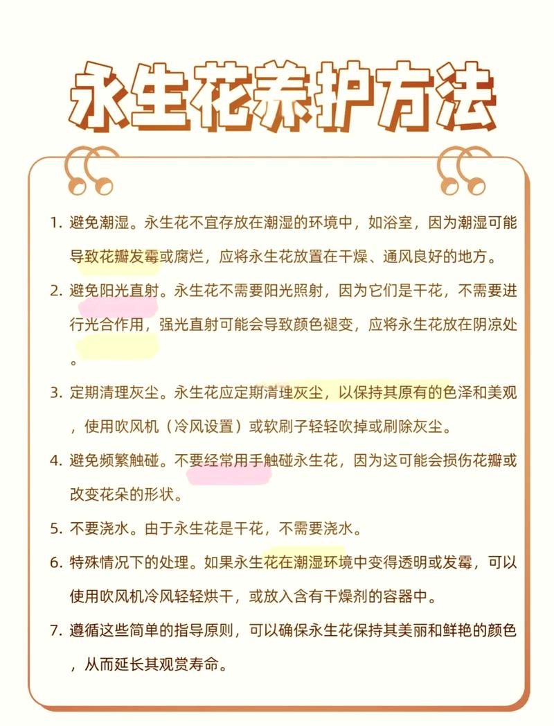 〖Four〗、永生花的养护关键在于保持其干燥、避免阳光直射和定期除尘。永生花,作为通过高科技手段制作的干花,无需浇水,这是其养护的基础原则。因此,应将永生花摆放在室内阴凉处,远离直射阳光,以防止其褪色或变形。同时,也要避免将永生花放置在潮湿的环境中,如浴室或靠近水源的地方,以防止其受潮发霉。