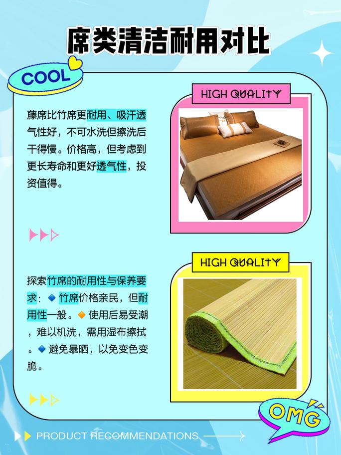 〖Two〗、竹席:竹席的费用相对藤席更为亲民,且性价比更高。在选取时,可以注意选取质量好的竹丝席子,以获得更好的使用体验。藤席:藤席尤其是天然藤席的费用通常较高,如果预算有限,可能难以选取到质量上乘的藤席。综上所述,在夏天选取竹席通常更为凉爽且性价比高。