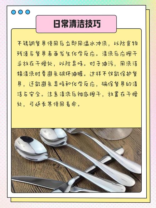 〖Four〗、不锈钢餐具第一次使用可以通过以下几种方法清洗:植物油法:在不锈钢餐具表面涂抹一层薄薄的植物油。将餐具烘干,使植物油均匀附着在表面。使用洗洁精清洗餐具,确保将植物油和污渍一并去除。最后用清水漂洗干净。番茄酱法:用湿毛巾蘸取适量的番茄酱。将番茄酱均匀涂抹在不锈钢餐具上。