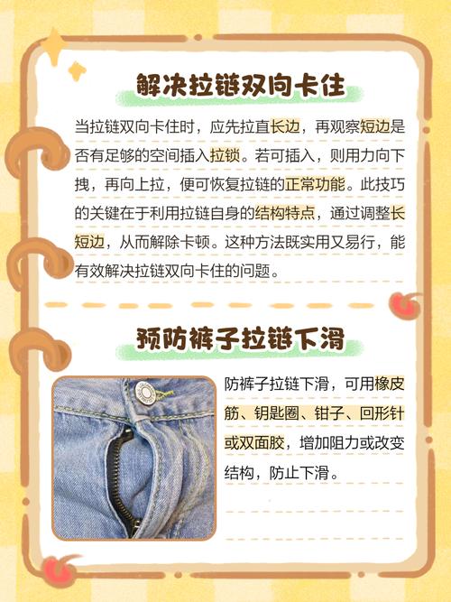 〖Four〗、拉链拉到上头卡死拉不下来,可以尝试以下几种方法。如果是拉链齿之间有异物导致卡死,可使用小刷子,如牙刷,轻轻刷去拉链齿上的灰尘、绒毛等杂物,刷的时候要小心,避免损坏拉链齿。之后在拉链齿上涂抹一些蜡,比如蜡烛,来回拉动拉链,让蜡均匀附着,减小摩擦力,看能否顺利拉动。