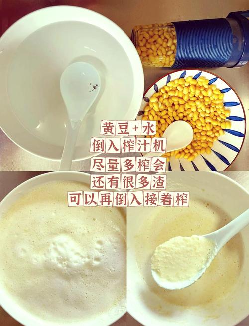 〖Three〗、首先,将黄豆清洗干净,确保它们没有杂质,然后将榨汁机接通电源。准备一个大杯子,将其放置在榨汁机的出汁口下方,以防豆渣或黄豆飞溅出来。下面,将黄豆装入榨汁机的贮存管,注意不要装得太满,留一些空间,然后用塞子封好,这样可以防止黄豆和磨过的豆渣飞出。