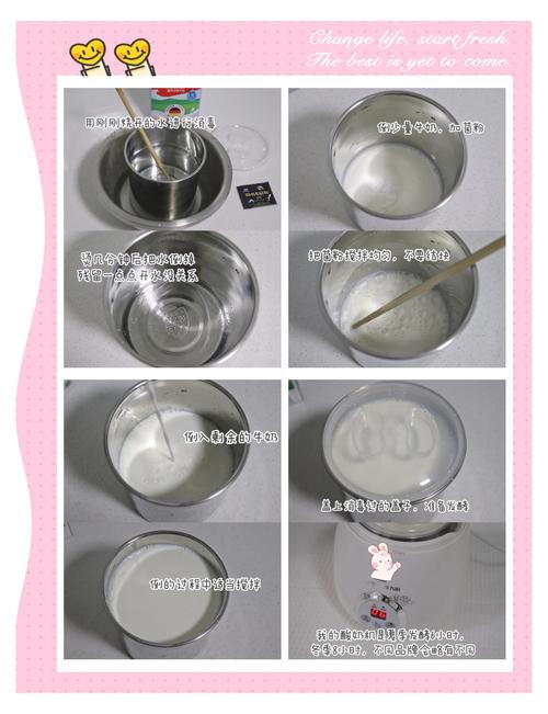 〖Six〗、家庭自制酸奶的做法步骤 请点击输入图片描述 1 找一个有盖的玻璃瓶,先用沸水烫两分钟,再取出擦干,注意要完全不留水分。请点击输入图片描述 2 将锅中烧开水,往玻璃瓶中倒入鲜牛奶,放在开水中烫5『1』0分钟,使鲜牛奶的温度达到烫手但不沸腾的程度(最佳温度是80『9』0度)。
