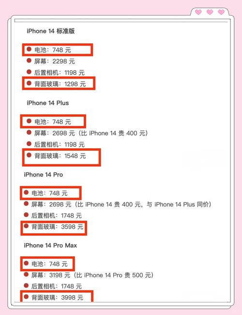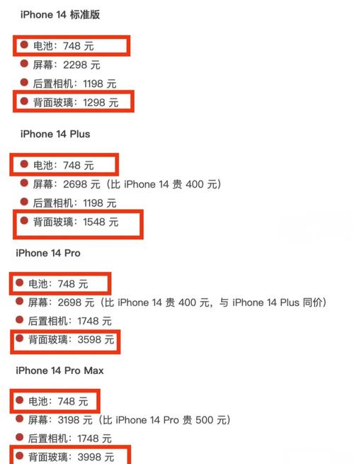 〖Four〗、Pro Max为3998元),远高于屏幕的2298元(Pro Max为3198元)。对于电池更换,所有型号的费用均为748元,但摄像头维修费用根据型号差异在1198元到1748元之间。因此,用户在使用iPhone 14系列时,务必谨慎对待,尤其是Pro系列的用户,可能需要考虑为后壳额外投资保护措施。