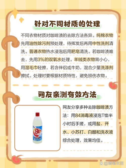 〖One〗、对于普通衣物上的咖啡渍,可以先用热水直接浇在污渍上,然后使用肥皂进行清洗。对于棉质衣物,可以使用油性除污剂进行初步处理,随后再用中性洗剂和氧化漂白剂进行彻底清洗。如果污渍尚未干透,可以使用牙膏涂抹在污渍处,然后揉搓。在衣服湿润的情况下,将牙膏涂在咖啡污渍上,用清水冲洗,再按照正常程序用洗涤剂清洗一遍。