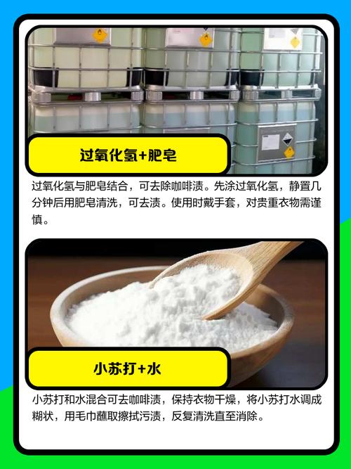 〖One〗、甘油+蛋黄:混合甘油和蛋黄,用其擦拭咖啡渍,干燥后用水冲洗。甘油+硼砂:在咖啡渍上涂上甘油,撒上硼砂,然后在沸水中浸泡。氨/硼砂+热水:使用稀释的氨水、硼砂和温水擦拭咖啡渍区域。3%过氧化氢溶液:用3%的过氧化氢溶液擦拭咖啡渍,然后用水冲洗。