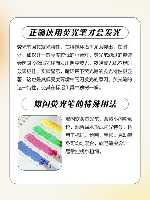 〖Five〗、如果荧光笔因风干或长时间未使用而无法出水,可以尝试用笔头蘸取少量酒精,或者向笔管内的海绵中滴入一两滴白酒。这样做可以激活笔头,恢复其出水功能。需要注意的是,并非所有干燥的荧光笔都能成功恢复。