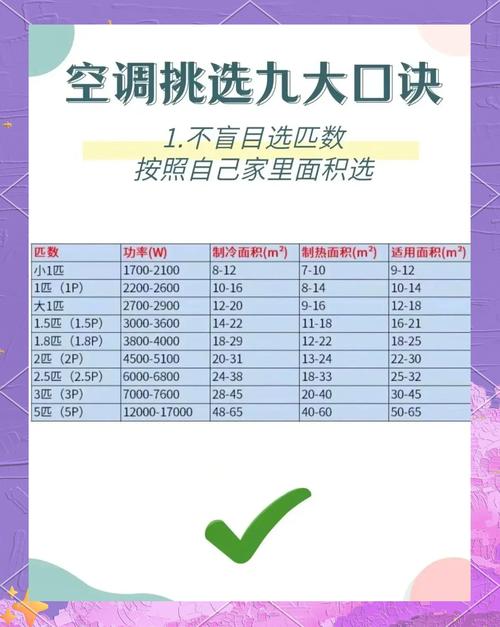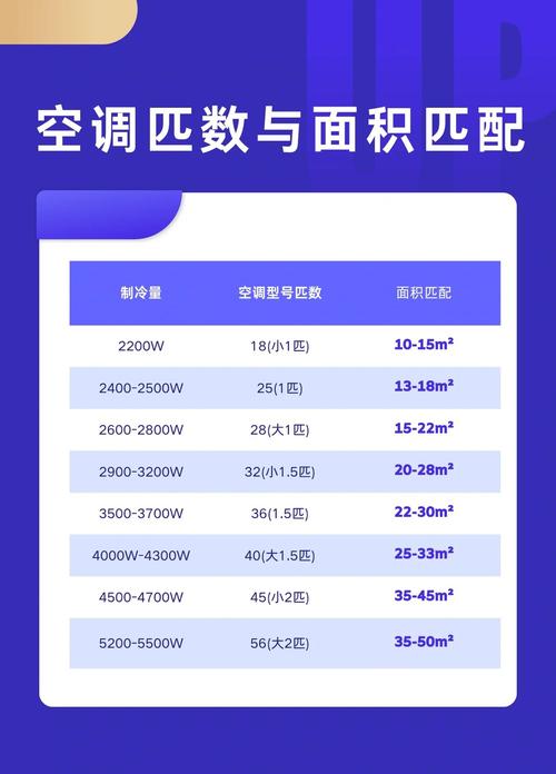〖One〗、根据居住空间大小选取: 制冷需求:一般建议选取制冷量为150250W/m2的空调。例如,如果居住空间为20平方米,那么所需的制冷量大约在30005000W之间。 制热需求:对于制热功能,建议选取制热量为250350W/m2的空调。同样以20平方米的空间为例,所需的制热量大约在50007000W之间。