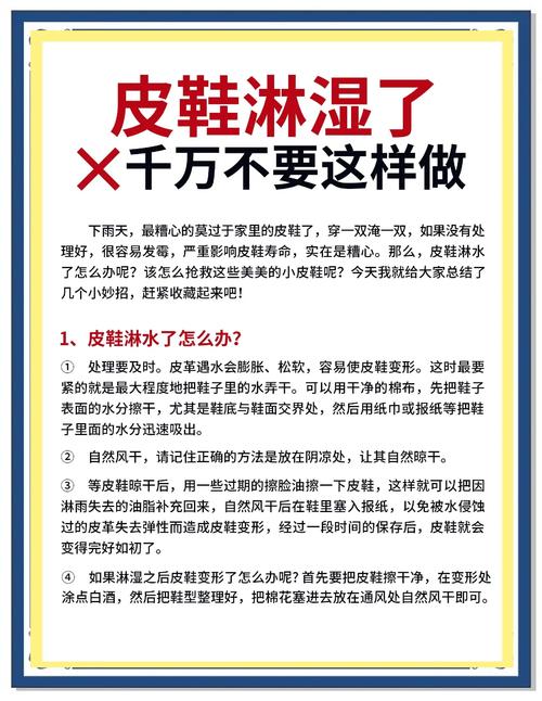 〖Four〗、皮鞋进水湿透了的处理方法如下:尽快除湿:使用吸湿布料:在鞋内放入一些吸湿效果好的布料,如旧毛巾或纸巾,静置1015分钟后取出。吹风机冷风干燥:使用吹风机调到冷风模式,对鞋子进行吹干,直至基本干燥。注意避免使用热风,以防皮质受损。