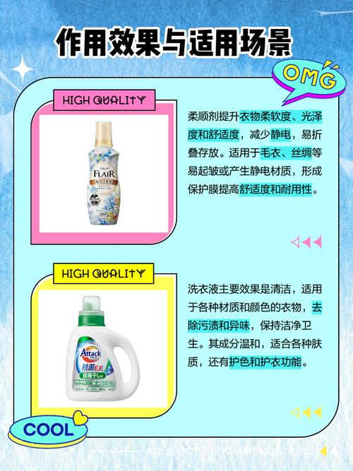 〖Five〗、且必须用清水完全漂洗干净。柔顺剂:在衣物清洗干净后使用,以达到最佳的护理效果。总结来说,洗衣液主要用于衣物的清洁,而柔顺剂则用于衣物的护理,两者在概念、成分、作用及使用顺序上均存在明显区别。洗衣液与柔顺剂的区别类似于洗发水与护发素,一个主要负责清洁,另一个则负责护理,两者不能互用。