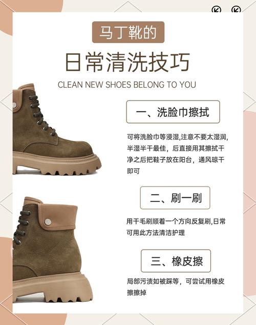 清洁麂皮马丁靴:- 使用专用麂皮刷刷去灰尘。- 喷洒清洁剂清洁,重点污渍多喷一遍清洁剂。- 用麂皮橡皮擦去除顽固污渍,恢复柔软性。- 涂抹同色系增艳剂,恢复颜色光泽。