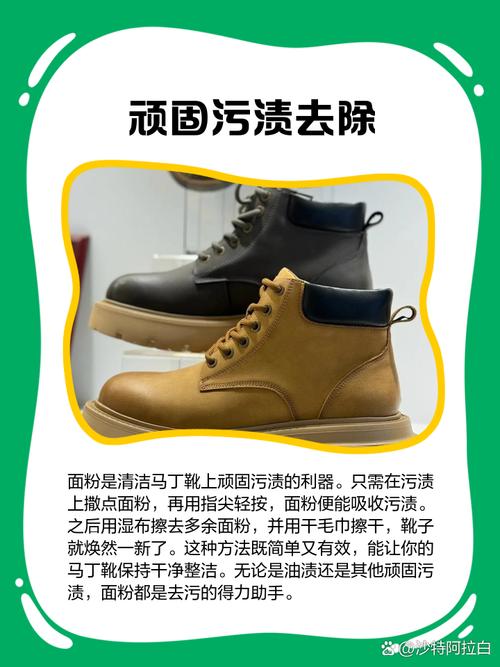 清洁皮革马丁靴:- 先用软布轻轻擦拭靴子表面灰尘。- 如有顽固泥渍,可用湿布擦拭。- 自然风干后,涂上鞋油,用软布均匀涂抹。- 放置通风处晾置1至2天,涂抹鞋油后。- 晾置时放入废旧报纸团,防止变形。 清洁反绒皮马丁靴:- 使用无纺布、棉布或软毛刷去除浮尘。- 撒上少量绒鞋粉,轻轻拍打,让多余粉粒落下。
