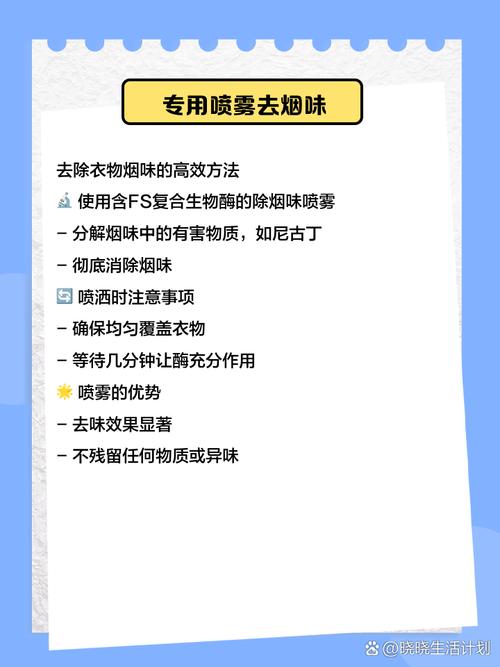 使用除烟味的清新剂是处理衣物上二手烟的有效方法。将清新剂均匀喷洒在衣物内外,然后将其晾置在通风良好的地方,二手烟味通常会在一段时间内逐渐消散。 在密闭空间吸烟的情况下,烟草和烟雾的残留可能需要几天甚至更长时间才能完全挥发。