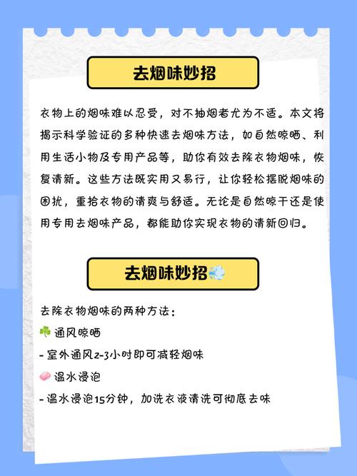 使用喷雾剂:将衣服挂在衣架上,喷上适量的水,然后撒上几滴柠檬汁和尤加利精油。稍作放置后,用干毛巾将水分吸干,再晾晒一会儿,即可去除烟味。 熨烫处理:如果衣服烟味较浓且急需处理,可以将衣服平铺,上面覆盖一块泡过水并拧干的毛巾。使用熨斗在毛巾上均匀熨烫,烟味会转移到毛巾上。