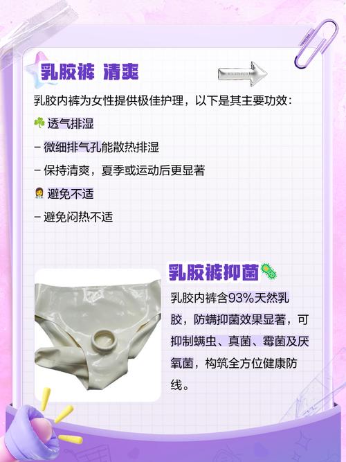〖One〗、乳胶内裤的好处主要包括以下几点:极佳的透气性与排湿性 乳胶内裤因其材料特性,具有极佳的透气性和排湿性。这意味着在长时间穿着的情况下,它能帮助身体有效散发多余的热气和湿气,保持私处的干爽舒适。这对于经常进行体育活动或处于潮湿环境的人来说,尤为重要,能有效减少因潮湿引起的不适和细菌滋生。
