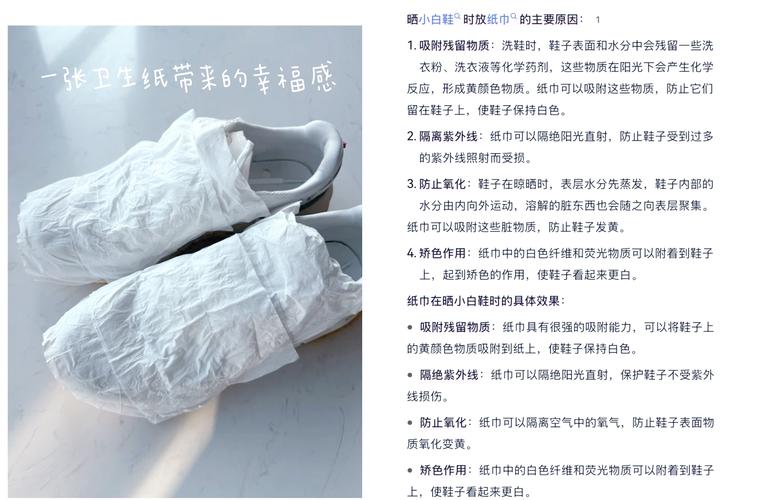〖Three〗、白鞋洗完包纸的原因主要有以下几点:防止变黄:白鞋在清洗后,尤其是使用洗衣粉或肥皂时,容易残留未完全漂洗干净的清洁剂,这些清洁剂在阳光照射下会导致鞋子变黄。纸巾可以帮助吸收这些残留物,从而防止鞋子变黄。