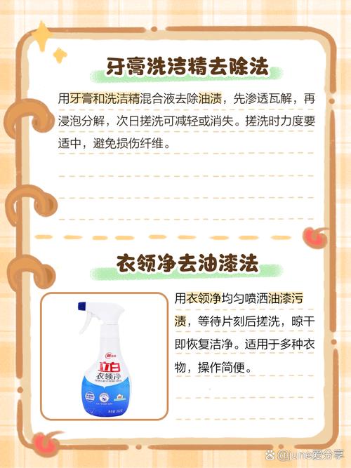 使用清凉油清洗:将清凉油涂抹在油漆渍上,等待几分钟,然后用棉花球沿着衣物的纹理擦拭。采用醋和洗涤灵:在油漆渍处滴上几滴醋,接着加入少量洗涤灵,共同搓揉,随后用水彻底冲洗,重复搓洗直至油漆渍消失。