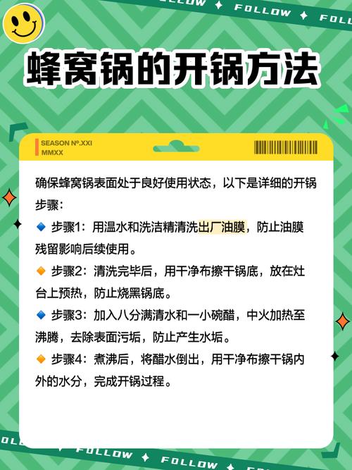 〖One〗、蜂巢铁锅的开锅方法主要包括清洗、润锅和保养三个步骤。首先,清洗是开锅的第一步,对于新购买的蜂巢铁锅,由于生产过程中可能残留一些杂质或油脂,因此在使用前需要进行彻底的清洗。建议使用温水和柔软的布或海绵轻轻擦拭锅内外表面,避免使用过于粗糙的清洁工具或强效清洁剂,以免损伤锅体表面的涂层。