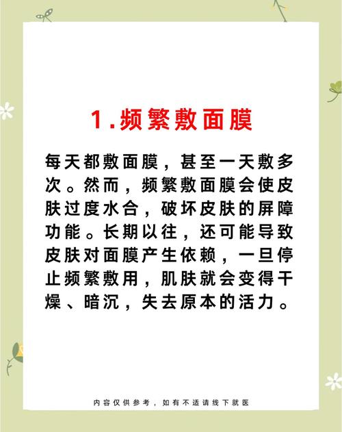 面膜一天敷两次不好。以下是具体原因:过度敷面膜可能导致皮肤问题:面膜虽然可以为皮肤提供营养和水分,但过度使用可能会对皮肤造成负担。一天敷两次面膜可能会让皮肤过于依赖外界的营养补给,而忽视了皮肤自身的修复和屏障功能。