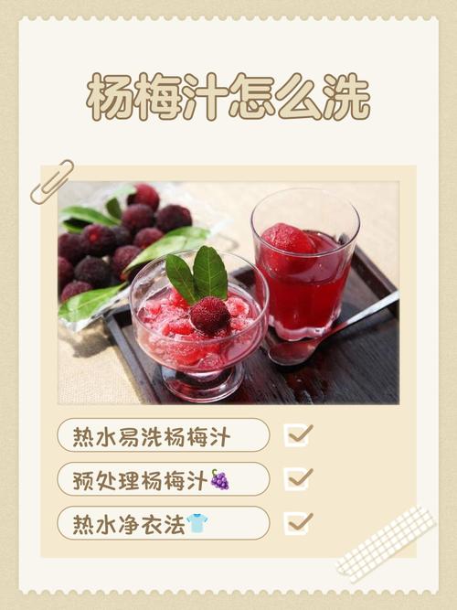 〖Five〗、要把杨梅汁洗得毫无残留,可根据沾染物品的不同选取合适方法。衣物沾染杨梅汁刚沾上时,可立即用盐水浸泡,再用清水冲洗;若是干渍,用白醋或柠檬汁涂抹在污渍处,浸泡几分钟后正常洗涤。家具或地板沾染杨梅汁可先用湿抹布蘸取洗洁精擦拭,若还有痕迹,用稀释的漂白水轻轻擦拭,之后用清水洗净擦干。