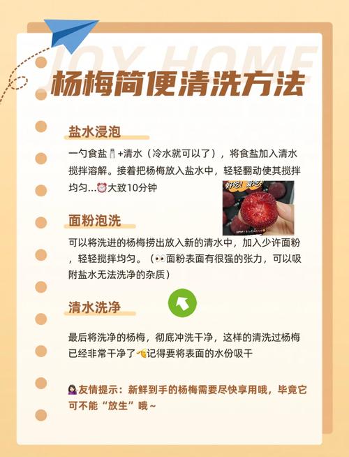 清洗掉杨梅汁较为简便的方法有多种。方法一:利用食盐和清水,在盆中加入适量清水,放入一勺食盐搅拌均匀,将沾有杨梅汁的物品浸泡其中,15 - 20分钟后,轻轻揉搓,杨梅汁会逐渐溶解在水中,再用清水漂洗干净即可。这是因为盐水有一定的清洁和溶解作用。方法二:借助白醋,在污渍处滴上适量白醋,稍等片刻后,用干净的湿布轻轻擦拭。