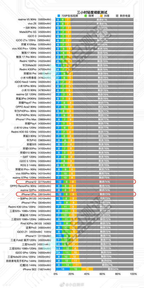 〖One〗、首先来看看这4款iPhone12的电池容量,iPhone12mini为2227毫安,iPhone12电池容量为2815毫安,iPhone12Pro为2815毫安,iPhone12ProMax为3687毫安。在第一轮续航测试运行2个小时后,此时iPhone12mini剩余78%电量,而iPhone12和12Pro剩余电量差不多,iPhone12ProMax剩余电量为89%,基本上锁定第一名。